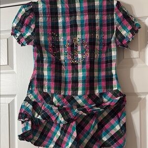 This button-down shirt from One Step Ahead features a vibrant pink and blue color palette, perfect for adding a pop of color to your wardrobe. The short-sleeved design offers a casual yet polished look, ideal for warm weather outings. Its classic button-down style ensures a timeless appeal.