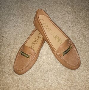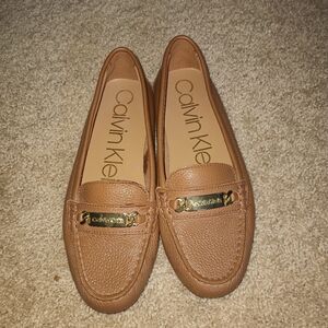 Elegant brown loafers by Calvin Klein. Features a stylish gold accent. Perfect for any occasion.