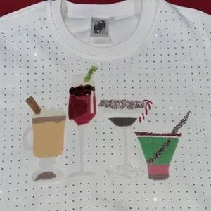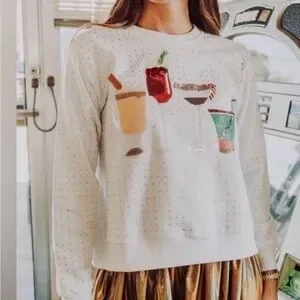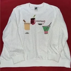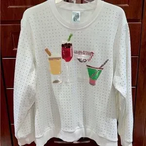 🍹🍸🥂This is a Queen Of Sparkles sweatshirt in size L with long sleeves, a pullover style, and a round neck. It features sequin and rhinestone accents on a white cotton/polyester material with fleece lining. The sweatshirt has a playful cocktails design and it is in excellent used condition.