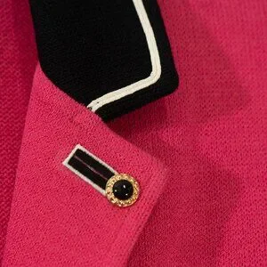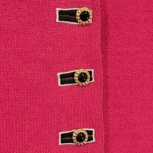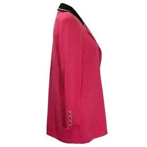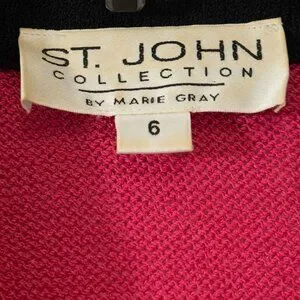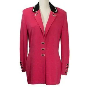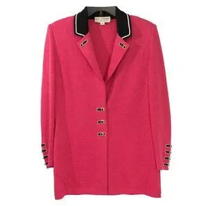 St John Collection Pink Blazer Catalina Knit Power Jacket 90s Style Barbiecore Coat, size 6. The St John Collection catalina knit is a medium weight knit power blazer with a professional and feminine / girly style. This statement jacket is long line with black details and a deep pink or magenta tone.