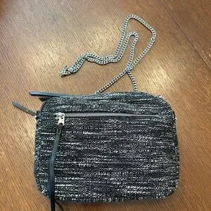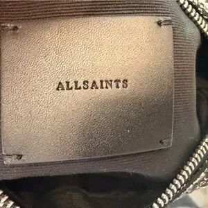 All Saints fleur de lis black and white crossbody bag with silvertone chain strap, zip pockets front and back, nwot quality