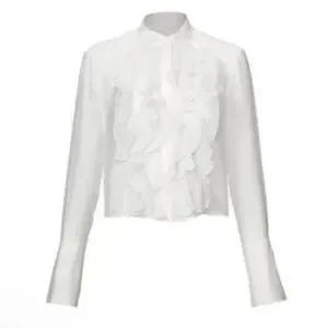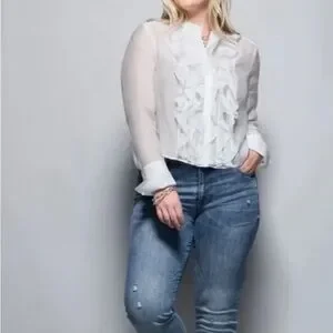 Unfortunately this beautiful Cabi shirt no longer fits me! Had a breast reduction. Chic CAbi blouse with elegant ruffles. Ideal for stylish occasions. Only worn one time!