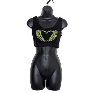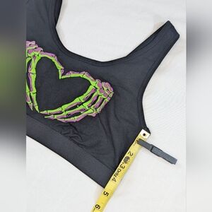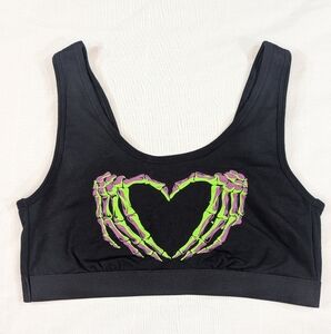 Get your spook on with this never-worn unlined bralette, featuring a scoop neckline and green and purple skeleton heart hands design.