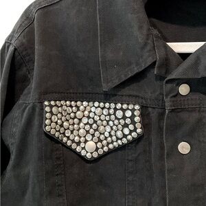 Embellished in silver studs and Swarovski crystals on the front snap pockets and a giant peace sign on the back.