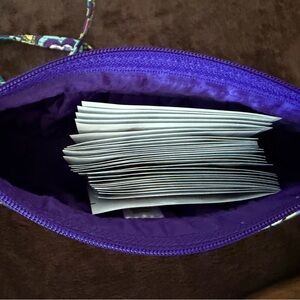 - Vera Bradley Frannie crossbody bag in the retired "Heather" pattern. It features a vibrant paisley and floral print in shades of purple, pink, green, and teal. The bag has a zip closure and an adjustable strap. It is in great condition with minimal signs of use. Perfect for a casual day out or travel.