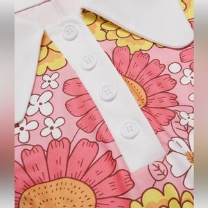 Chic floral A-line dress featuring vibrant pink, yellow, and white patterns. Accented with a classic white collar and cuffs. This dress is brand new with tags.