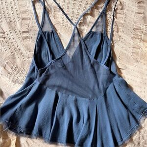 Blue camisole with a deep V-neck. Flowy silhouette and delicate straps. Mesh detail on trim and a mesh back.