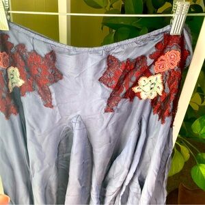 Size 12 L. Never worn. Silky material with a periwinkle purple-blue color, flare paneling, and floral applique detail. No stretch.