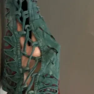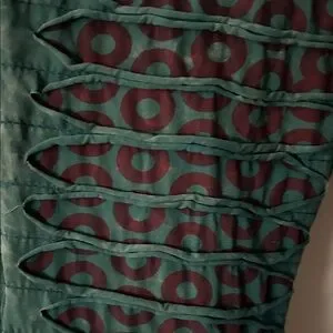 Stylish teal flare pants with iconic phish donut red circular patterns. Unique side lace-up design adds a bit of sexy festival. Comfortable and trendy with some stretch. Low rise. Probably fit a size 8-10 best. Bought on lot this summer from a great vendor but sadly just a bit too small for me and can’t return. As far as I can tell, not sold online! Never worn, only tried on and washed on gentle cycle with cold water. Originally paid $90 so discounted to sell!