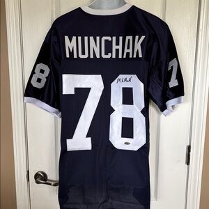Vintage Mike Munchak Penn State Autographed Jersey. All letters and numbers are stitched. Some blue color bled on the numbers but jersey is in excellent condition. TRISTAR COA and the size is a men’s XL.