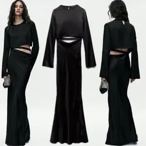 NWT Zara Black Satin Effect Cutout Waist Strap Maxi Dress. Long flared sleeves and high neck. Single button at back of neck. Concealed side zipper closure on the right. 100% viscose.