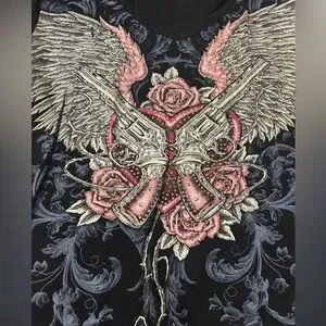 This shirt is in good used condition and has been worn many times. It has no rips, snags, tears, or stains, but has been worn lots. Special features include stretchy material, v-neck, and detailed design.