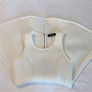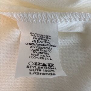 Elegant white polyester blend garment. Made in the USA. Has some stretch.