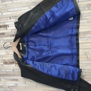 Good condition 100% lamb leather biker jacket by J Brand. Black with crocodile pattern. Classic and chic look, perfect to punch up any outfit. Some wear on leather and inside lining. Lining is more purple than blue in photo.