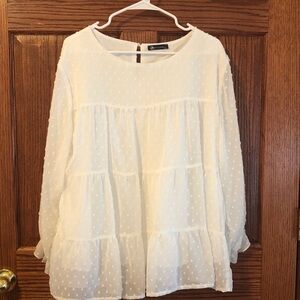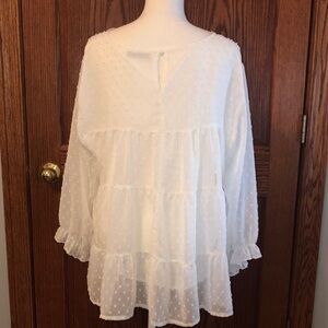 Elegant white sheer blouse with polka dot design. Features a tiered style for a chic look.