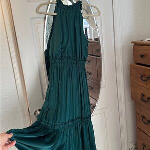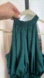 Stylish sleeveless blouse in vibrant teal. Features a gathered neckline for added elegance. Size medium. Ties in the back. Strings have a gorgeous gold detail on them. Beautiful dress. Only worn once.