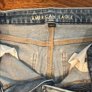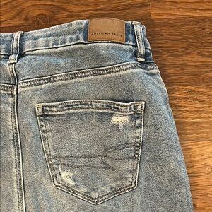 Light blue denim jeans with subtle distressing. Classic five-pocket style. Comfortable and versatile.