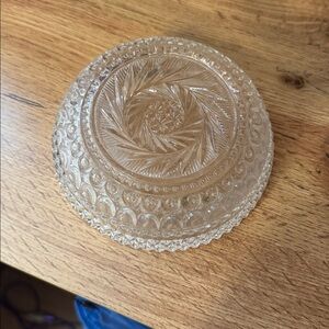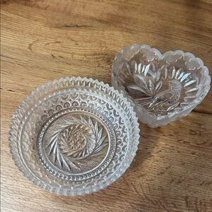 Set of two clear glass bowls with intricate designs. Perfect for decor or serving.