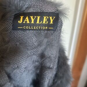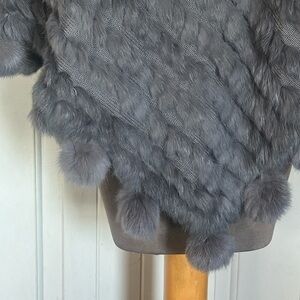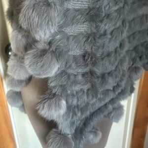 Capes are officially trending for F/W 25 ! This is gorgeous in a medium grey angora fur ! The fabric between fur channels is a thinner sweater knit but tightly woven see pic . Hem is angora Pom poms! Dress up or down it pulls on overhead lightweight imo! Just to note Pom poms could be removed easily imo they are just slip knotted with sturdy corded fabric if so desired without damaging the cape itself Soo buttery soft !