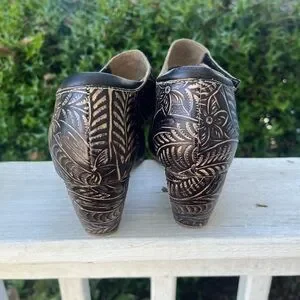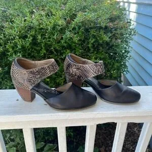 The L'Artiste by Spring Step Toolie Women's Mary Jane Shoes are stylish black leather shoes with a Mary Jane style strap for added comfort and support. Known for its quality and unique designs, this brand offers a fashionable and practical option for women looking for a comfortable heel. The size 8.5 fit ensures a comfortable and stylish option for everyday wear or special occasions. Good condition.