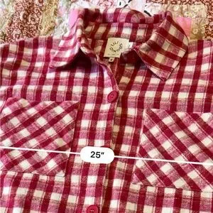 Cozy red and white plaid shirt jacket with button-up front and chest pockets.