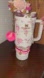 Brand new never used. NWOT. Stanley LOVESHACK FANCY-40oz tumbler with pink floral pattern. Includes pink pom-pom keychain, fancy floral straw attachment, pearl strap/handle, white silicone bottom cover, and stretchy bracelets!