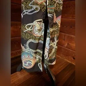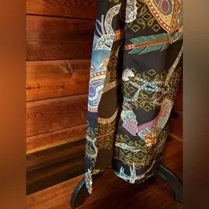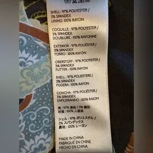 97% Polyester 3% Spandex. Lining 100% Rayon. adjustable spaghetti strap dress. Side slit on both sides. Back tie at waist. Size zipper plus hook and eye. Beautiful condition. Gently worn.