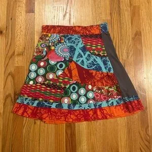 Vibrant A-line skirt by Desigual. Features bold patterns and colors. Perfect for a statement look. In good condition, no rips stains or holes.