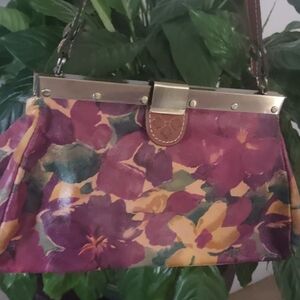This elegant floral handbag features a vibrant mix of colors, perfect for adding a touch of style to any outfit. Its unique design makes it a standout accessory.