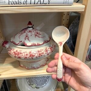 Bring cozy fall charm to your table with this beautiful Cracker Barrel soup tureen. Crafted from durable porcelain, it features a red floral pattern on a creamy white base with scalloped edges and hand-painted detailing. The matching lid and ladle complete the classic, heirloom look — perfect for serving soups, stews, or festive holiday dishes.