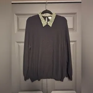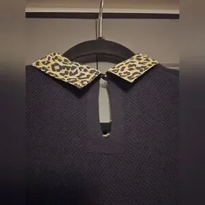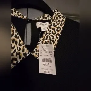 Elegant black knit top with animal print collar. Versatile and chic for any occasion.