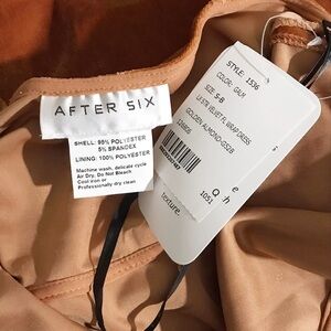 Brand new After Six 1536 Velvet Wrap Maxi Evening Dress Pockets. Color is Golden Almond Tan. Made with gorgeous lux velvet in a flattering wrap style with a beautiful ballet back and modified circle skirt, this stunning maxi dress really makes a statement. Pretty pleated detailing and side pockets allow for easy wear and endless elegance. Lux velvet has plenty of stretch.