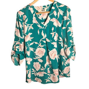 Verse Maternity Women’s Blouse Green Floral V Neck Roll Tab Sleeve Size L