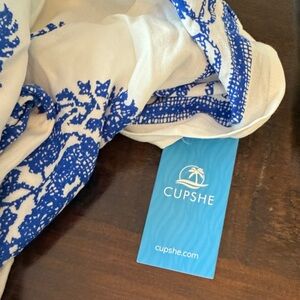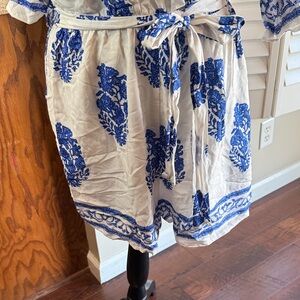 Stylish wrap jumpsuit with blue floral print. Features a tie waist and three-quarter sleeves. Perfect for casual outings.
