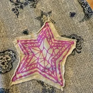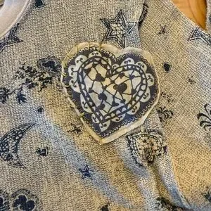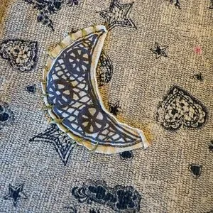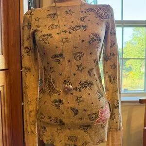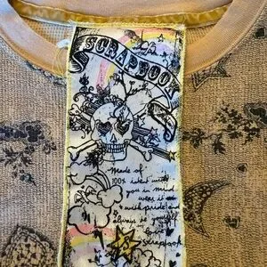 Beige shirt with bold Scrapbook graphic. Features black heart, moon, star and floral design. Yellow accents enhance style.