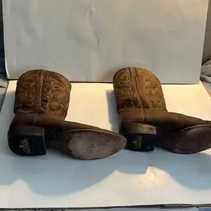 Classic cowboy boots with intricate stitching. Durable leather construction. Perfect for everyday wear.