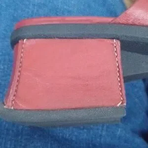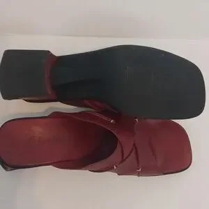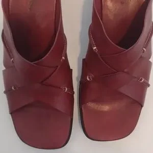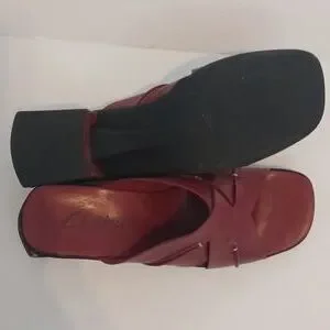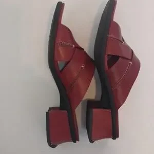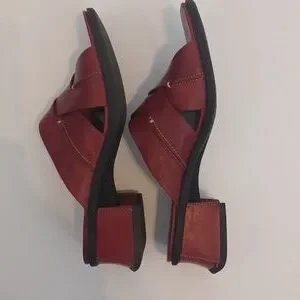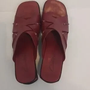 Clarks vintage red leather sandals sz.9.5. Small heel. EUC! Criss cross design. White thread stitching.