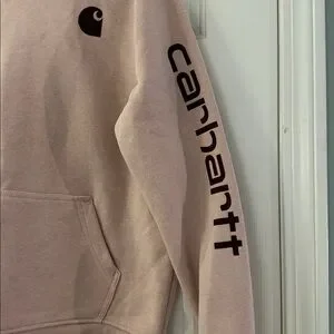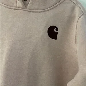 Carhartt hoodie. Features logo on chest and sleeve. Comfortable and stylish. Color is blush pink with burgundy logos. Worn twice. Excellent condition.