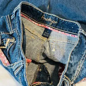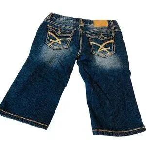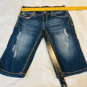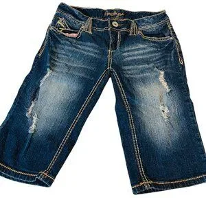 These Amethyst capri jeans offer a stylish, worn-in look with their distressed detailing. Made from durable denim, they provide comfort and a flattering fit. The classic blue shade complements various tops, making them versatile for casual outings or relaxed settings. Ideal for those seeking a blend of style and functionality in their wardrobe.