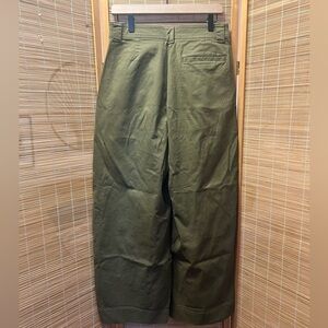 Olive green extra high-rise trousers with a relaxed fit. Tag size 6, but fit runs big.