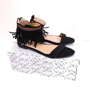 Boho Fringe Flat Sandals Black