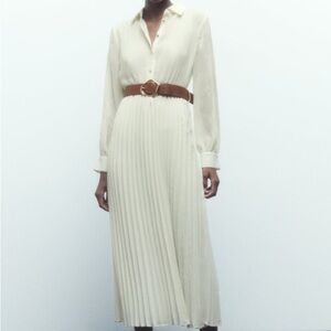 Chic long sleeve dress with pleats. Features a classic collar and button front. Perfect for elegant occasions.