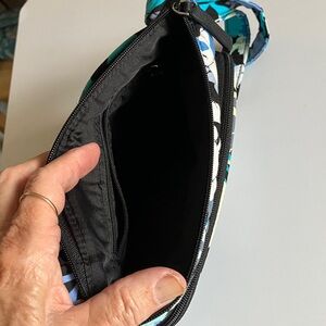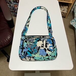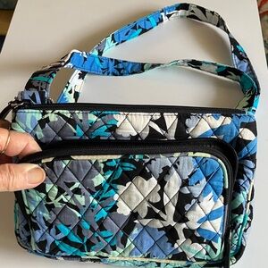 Stylish quilted crossbody bag with a floral pattern. Features shades of blue, black, and white. Vera Bradley. great condition