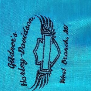 EUC Long Sleeve V-neck top by Harley-Davidson. Size Large. Blue with Embroidered Black Harley-Davidson detail on the front. Slightly ruched side panels. Embroidered Black Bar & Shield on the right cuff as well as (my favorite) thumb holes! Slightly hi-lo in design for riding comfort. Dealership logo embroidered on the back in Black from Gildner's Harley-Davidson, West Branch, Michigan.
