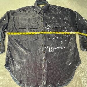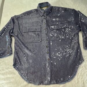 Stylish oversized collared button-down with front chest pockets and shimmering sequins. Ideal for casual wear.