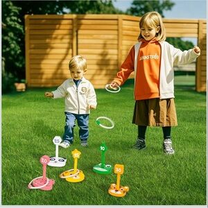 Fun and colorful animal ring toss game set for kids. Includes vibrant orange, yellow, green, pink, and white colors. Perfect for indoor and outdoor play.