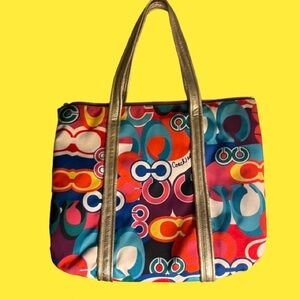 Vibrant Coach tote with a multicolor pattern. Features gold handles and trim. Perfect for adding flair to any outfit.