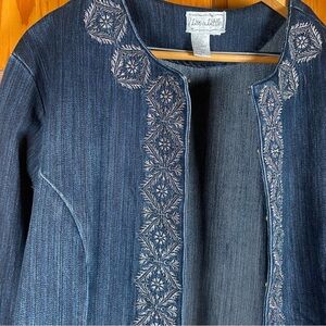 This stunning Jean Jacket by Live a Little showcases a deep navy blue color with exquisite embellishments that elevate its style. The long sleeves and intricate embroidery along the front and cuffs add a touch of elegance to this versatile jacket. Ideal for both casual and sophisticated settings, it is a must-have piece for any wardrobe!