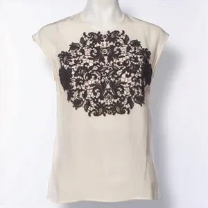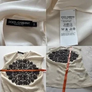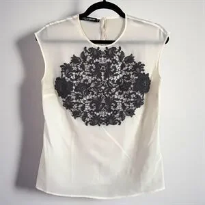 Elevate your wardrobe with this exquisite Dolce & Gabbana Silk Blouse, a stunning example of iconic Italian luxury. Crafted from beautiful cream silk, this elegant top features cap sleeves and is centered around a breathtaking, ornate black lace appliqué across the chest. The design is perfected with subtle crystal embellishments and charming crystal-centered buttons, highlighting the meticulous craftsmanship D&G is known for. This piece is a EU 38 / US Small and is in otherwise excellent condition, showcasing dazzling lace and vibrant details. Note: There is a slight, faded marking on the right side of the chest (possibly from deodorant or pressing), which is not highly noticeable when worn and may be removable with dry cleaning. This gorgeous blouse is ready to bring timeless Sicilian drama and sophistication to your collection.