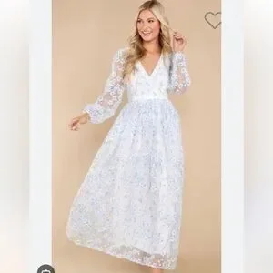 Stunning white maxi dress with delicate blue floral patterns. Features sheer long sleeves and a flattering V-neckline. No stains trades or tears. Rare find.